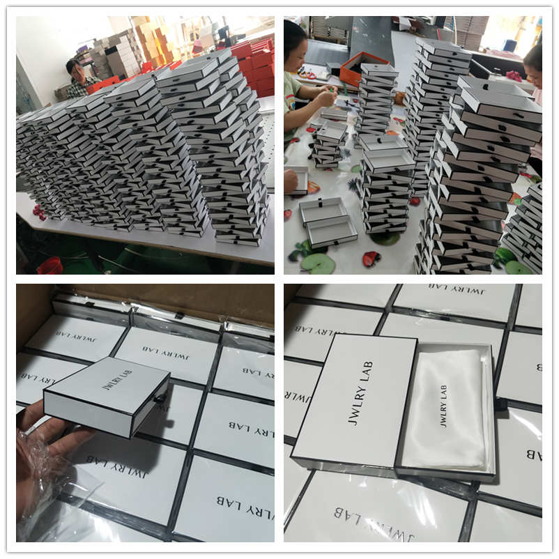 Niestandardowe pudełko przesuwne , wykonany z papieru artystycznego o gramaturze 120 g/m2, oprawiony w sztywną tekturę premium o gramaturze 1200 g/m2, z czarnym nadrukiem logo i czarną ramą, satynowa wkładka do etui opakowania na biżuterię